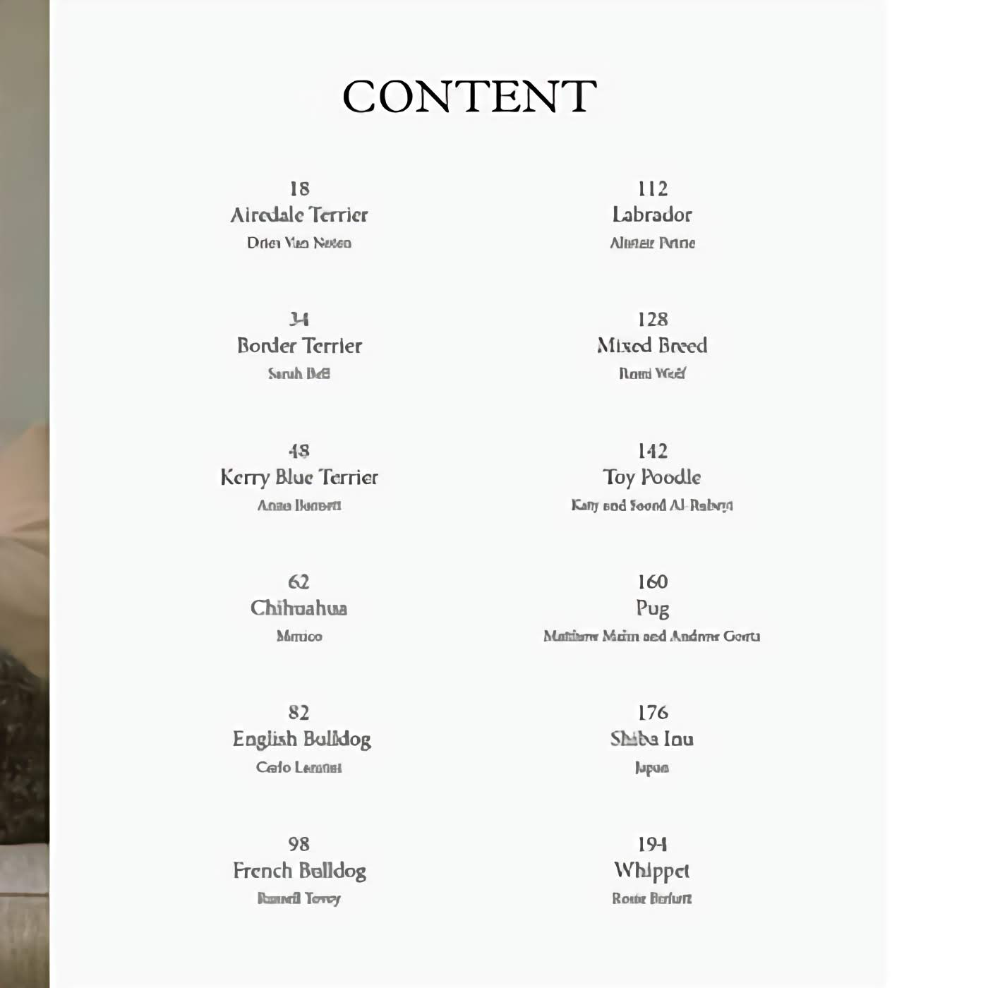 The book includes profiles on breeds such as French and English Bulldog, Labrador, Whippet, Border Terrier, Chihuahua, Toy Poodle, and more.