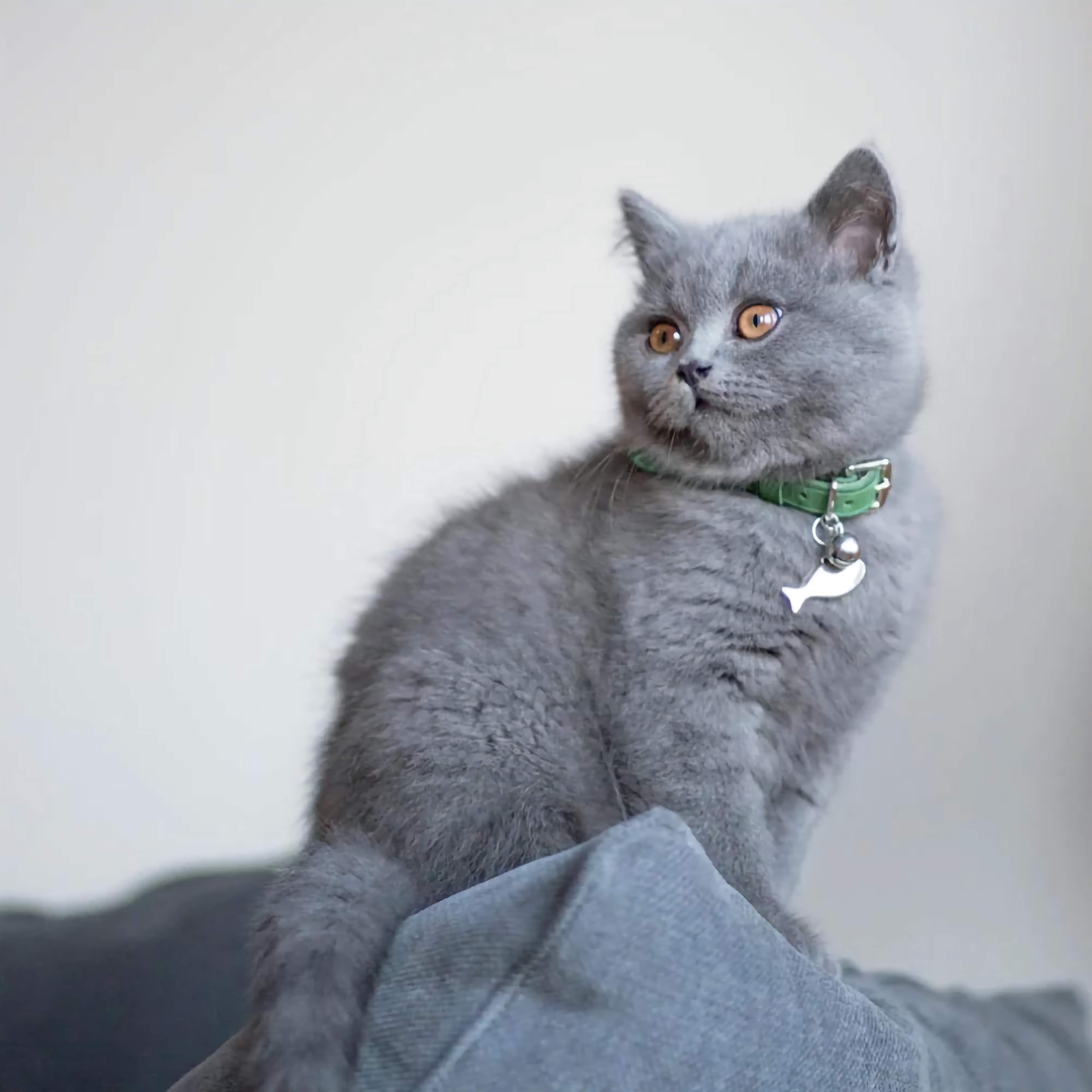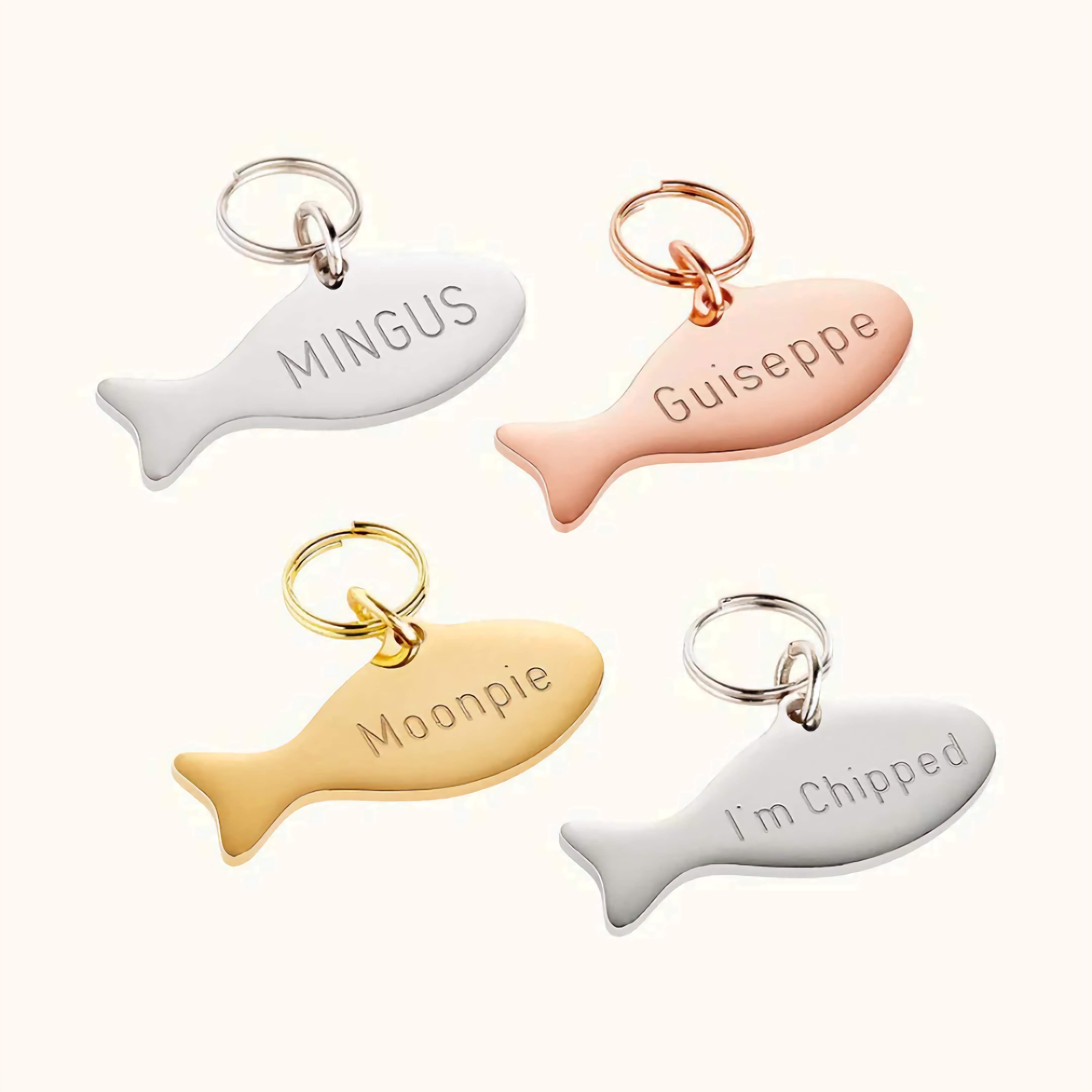 Cheshire & Wain's cute fish-shaped cat tags are available in Gold, Silver, and Rose Gold Plated.