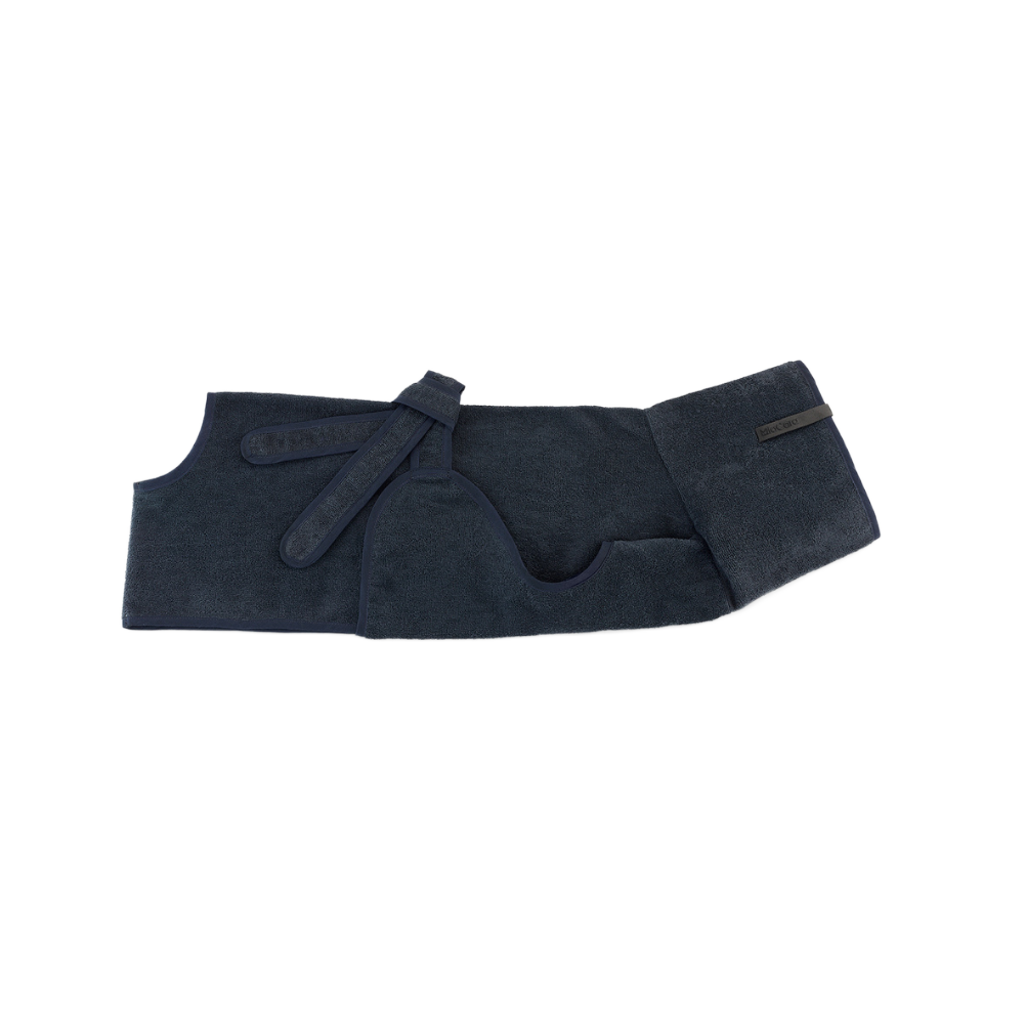 Wrap your furry friend up in the soft organic terrycloth Bagno dog bathrobe. The robe is perfect for drying your dog after a bath, a swim, or a romp in the rain. The particularly soft and absorbent cotton terry fabric draws moisture and dirt right down to your dog’s undercoat.